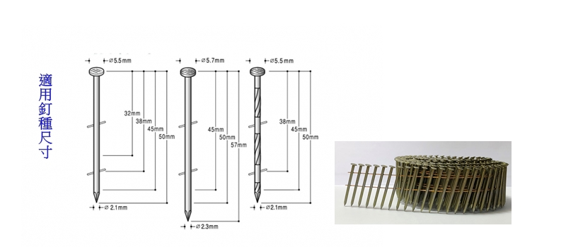 適用釘種: 平滑釘、螺旋釘、環紋釘